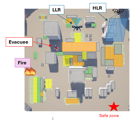 We train a team of heterogeneous UAVs to coordinate and guide human evacuees to safety during urban fires. By modeling the problem as a POMDP and using PPO with recurrent policies, our drones can locate and assist panicked evacuees under partial observability.